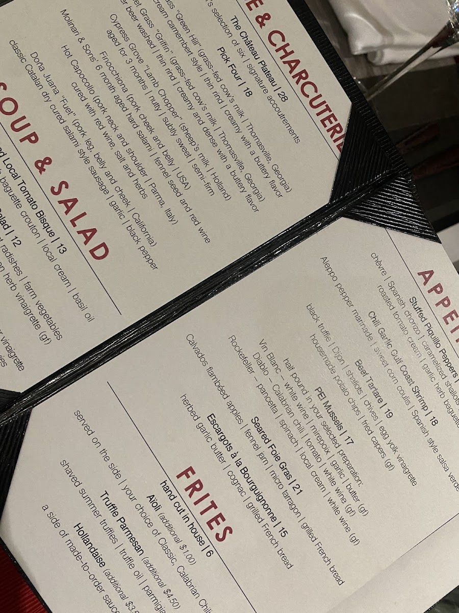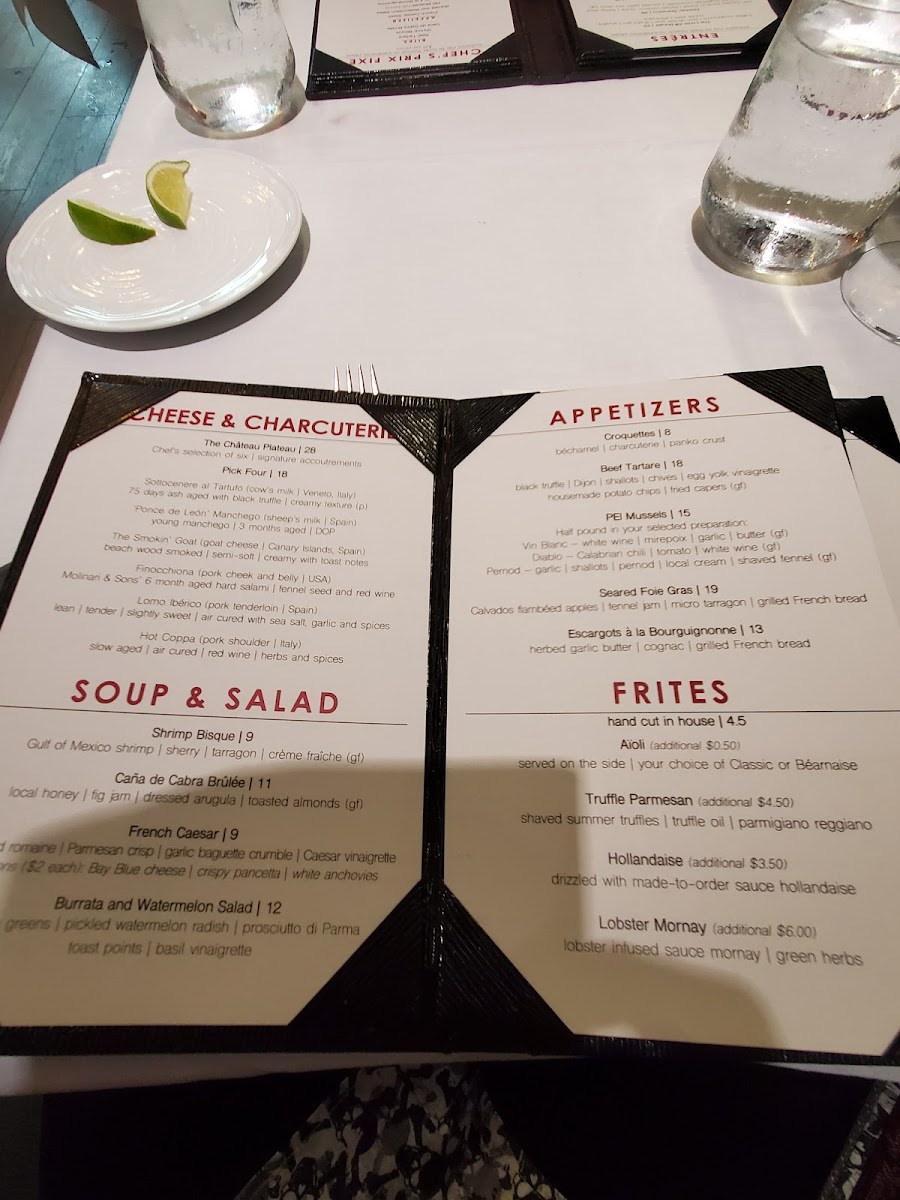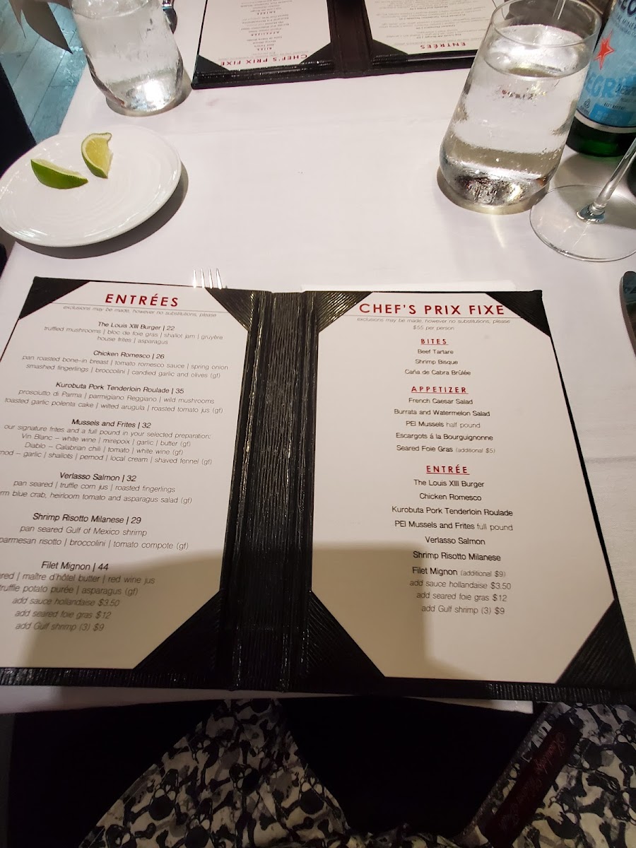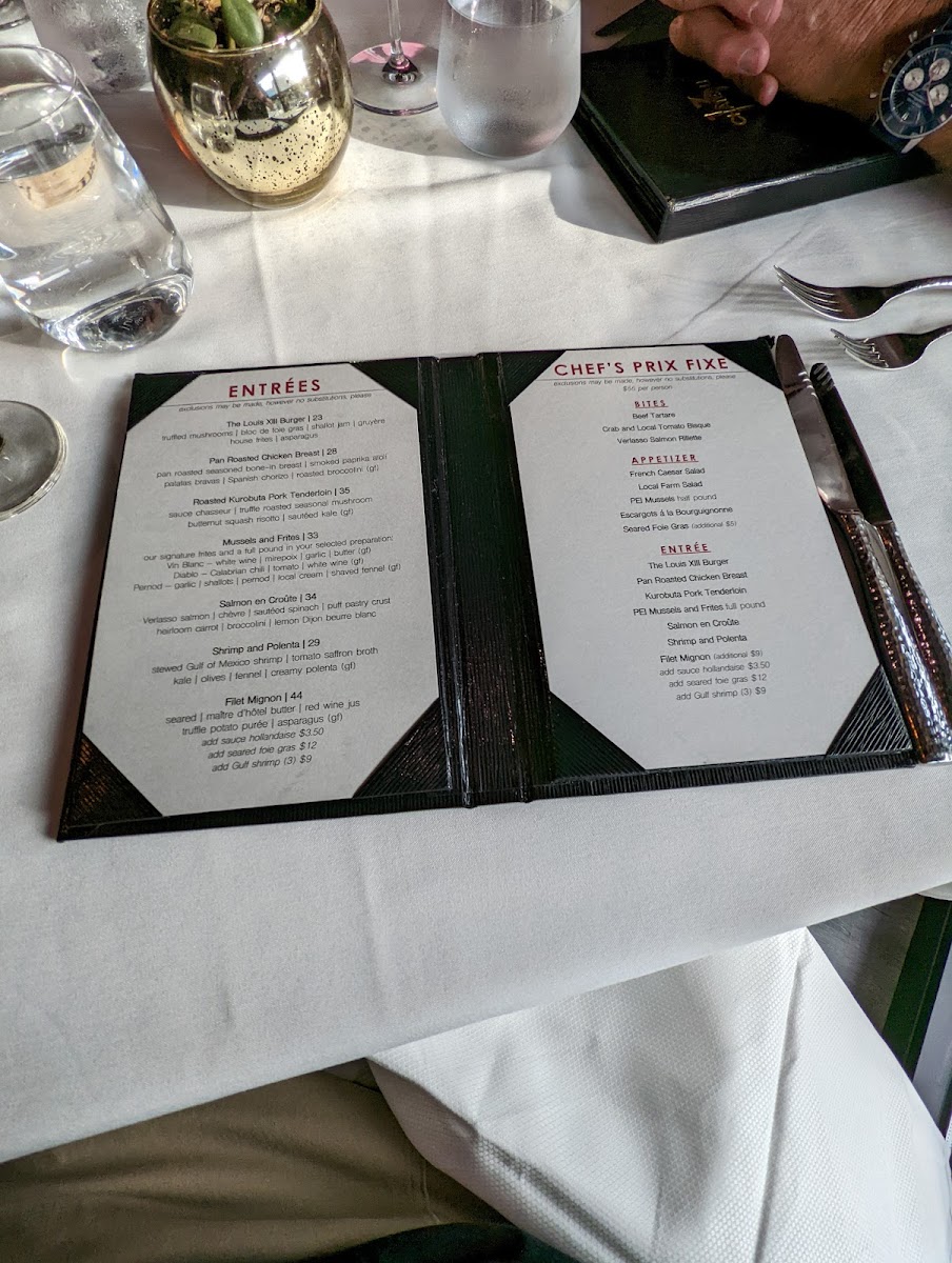 As a final impression, the menu at Château 13 feels like a confident celebration of classic French technique paired with approachable, modern comfort. From the very first bites, the Potato Leek Bisque, Seared Foie Gras, Beef Tartare, Escargots à la Bourguignonne, and Gulf Shrimp Escabeche set a refined yet welcoming tone, offering depth, balance, and thoughtful execution. The salads-French Caesar, Crab and Chèvre Stuffed Piquillo Peppers, and Roquefort and Pear Salad-add freshness and contrast, showing care in both flavor pairing and presentation. Moving into the heart of the menu, entrées such as The Louis XIII Burger, Duck Leg Confit, Pork Osso Buco, Mussels & Frites, and Local Fresh Catch highlight the kitchen’s versatility, ranging from indulgent and hearty to light and seafood-forward. The mussel selection-Mussels Vin Blanc, Mussels Diablo, and Mussels French Curry-stands out as a clear specialty, offering distinct flavor profiles that cater to both traditionalists and adventurous diners. Complementing these dishes, the frites options-Handcut Frites, Aïoli Frites, Truffle Parmesan Frites, and Hollandaise Frites-feel thoughtfully elevated, turning a simple side into a memorable component of the meal. Ending on a sweet note, desserts like Flourless Chocolate Torte, Champagne Poached Pear, Grand Marnier Crème Brûlée, Mousse au Chocolat, and the Cheese Plate provide a polished and satisfying conclusion. Overall, the menu comes together as a cohesive, well-curated experience that reflects both culinary confidence and respect for classic French flavors, making Château 13 a place where the food itself leaves a lasting impression.